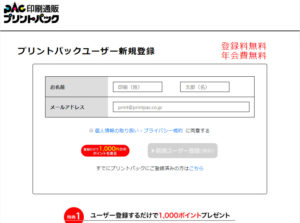 ネット印刷での印刷注文には会員登録が必要になるので、最初に済ませてしまいましょう。注文確定時に登録を行なうこともできますが、先にしておくとスムーズです。