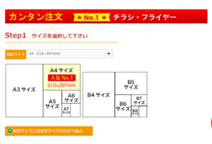 今回はチラシ印刷をしたいため、プリントパックの商品一覧からチラシ・フライヤー印刷を選択し、印刷サイズを指定します。今回はA4です。