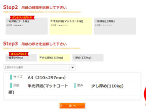 次に、印刷用紙と紙の厚さを決めます。用紙についての説明もありますので、希望に近いものを選択します。