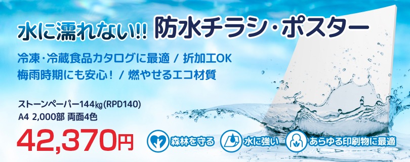 防水チラシはストーンペーパー144kgの場合、A4・片面カラー印刷・最小ロット2000部なら税込み34640円で注文OK!