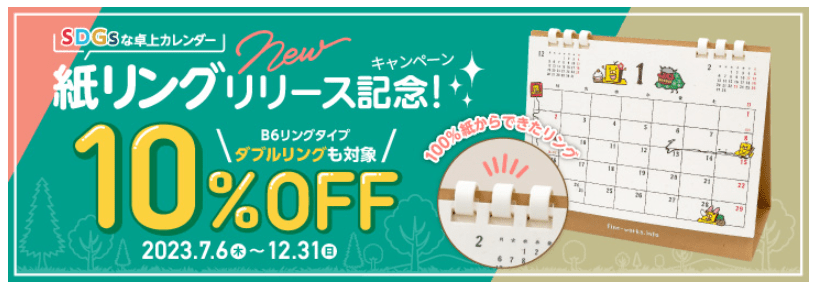ちなみに2023年7月6日から12月31日までの期間、紙リングリリース記念としてB6のリングタイプ卓上カレンダー印刷が10%オフになるお得なキャンペーンが行なわれます。