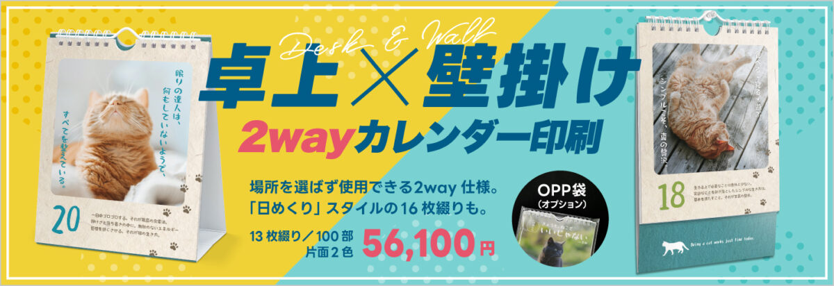 ファインワークスの卓上壁掛け2wayカレンダーは、オフセット印刷・100部から発注OKの商品となります。