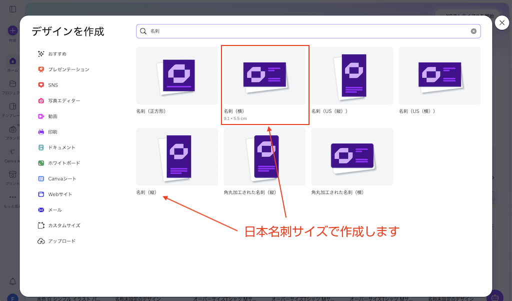 新規から作る場合は「デザインを作成」から名刺のサイズを選びます。