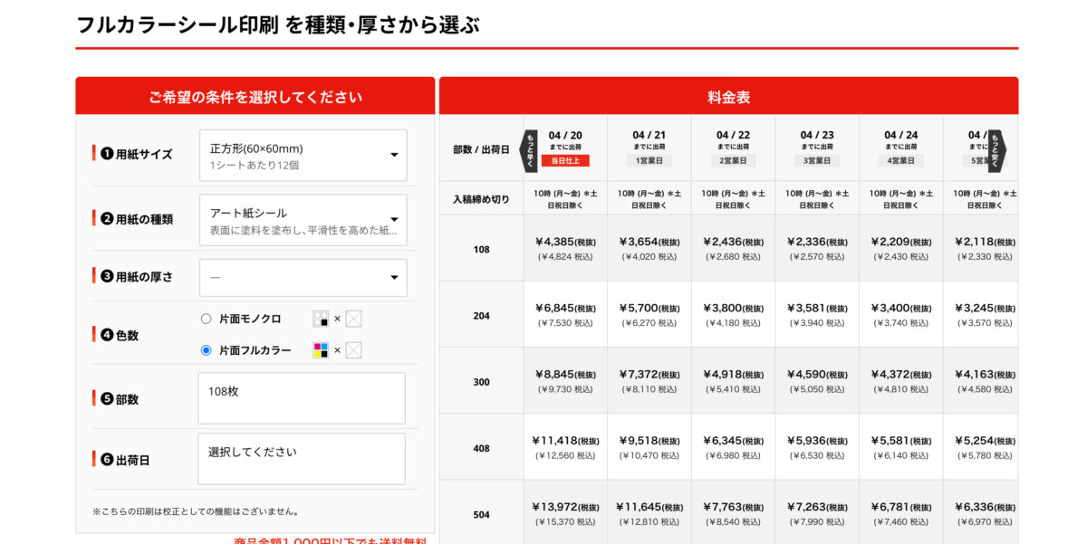 入稿するデザインデータが用意できたら、サイトからフルカラーシールを注文します。