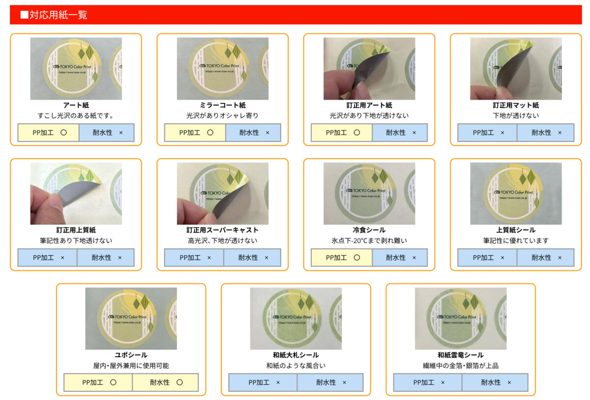 東京カラー印刷のフルカラーシール印刷では11種類の用紙が用意されています。
