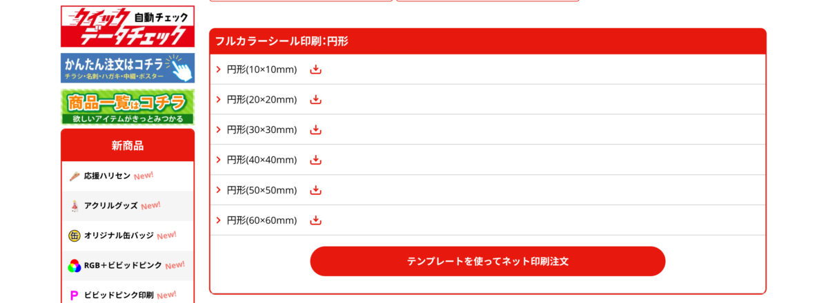 今回は円形(60×60mm)のシールを作成するので、「円形(60×60mm)」の項目をクリックしてテンプレートデータをダウンロードします。