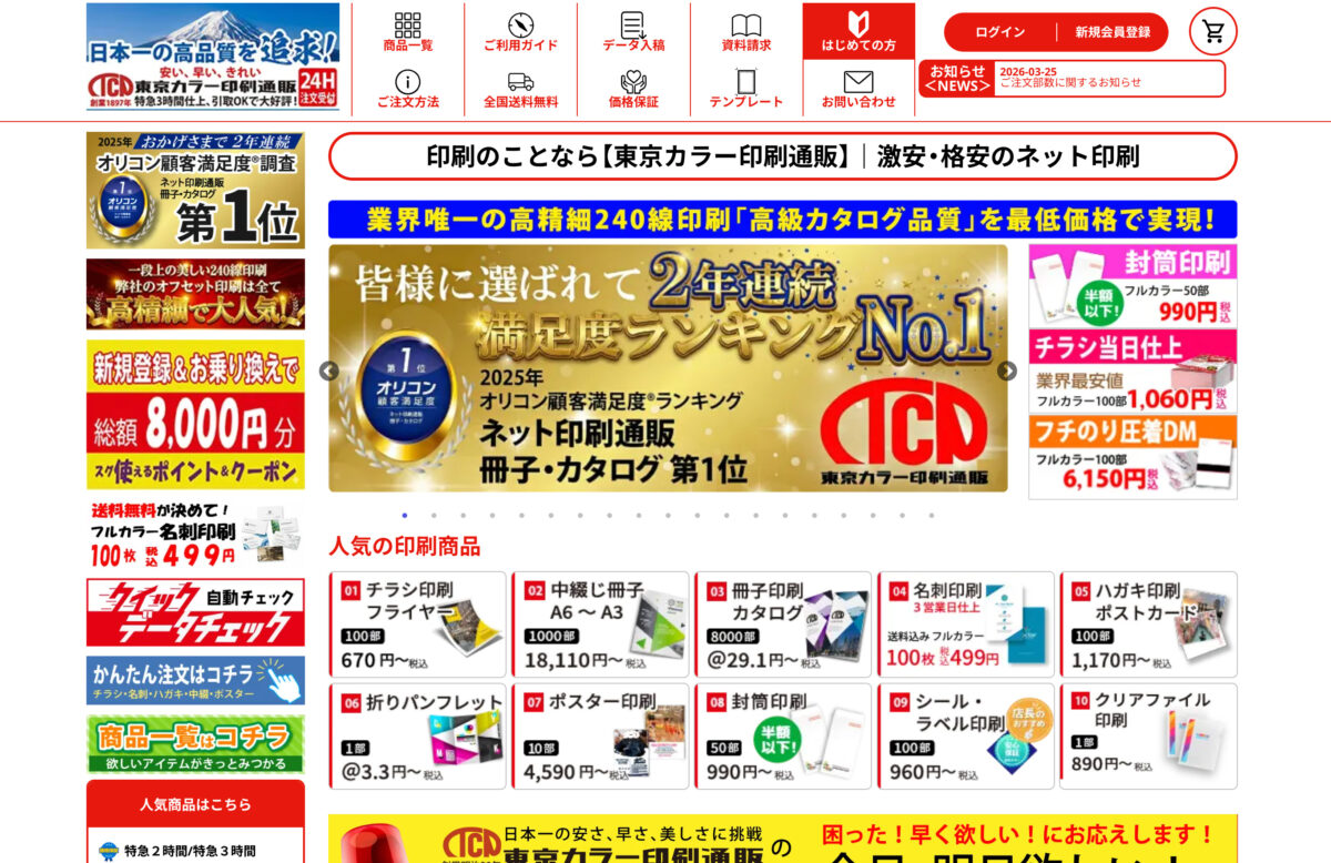 東京カラー印刷は「早さ」と「安さ」が魅力のネット印刷通販サイトです。