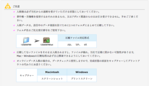 ネイティブデータを入稿する際には、アウトライン化したデータファイル、必要ならばリンク画像(埋め込みも可)、データの完成状態の画面キャプチャをまとめてフォルダに入れ、フォルダ名をご注文受付番号にしてから、zip、lzh、sitなどの圧縮ファイルにします。詳しくは「データの入稿について 」のページに解説がありますので、こちらを事前に確認しておきましょう。「ホームページから入稿」ページの下部の「ご注意」項目にも簡単な解説があります。