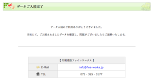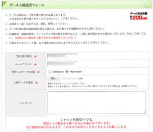 注文手続が完了し、「データご入稿」ボタンをクリックするとそのまま「ホームページから入稿」ページが表示されます。